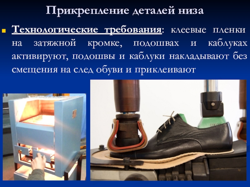 Технологические требования: клеевые пленки на затяжной кромке, подошвах и