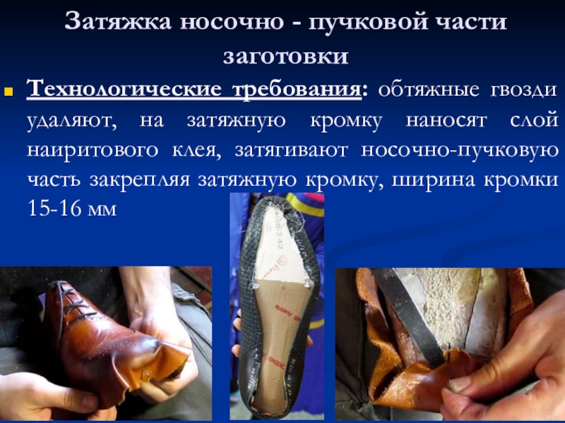 затяжную кромку наносят слой наиритового клея, затягивают носочно-пучковую часть закрепляя затяжную кромку, ширина кромки 15-16 мм