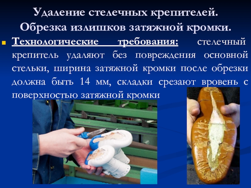 без повреждения основной стельки, ширина затяжной кромки после обрезки должна быть 14 мм, складки срезают вровень с поверхностью затяжной кромки