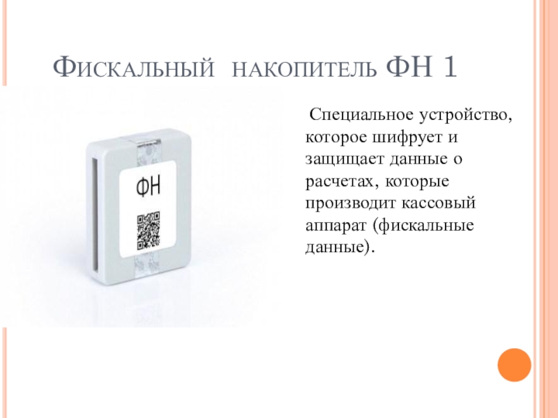 Фискальный накопитель ФН 1  Специальное устройство, которое шифрует и защищает данные о расчетах, которые производит кассовый