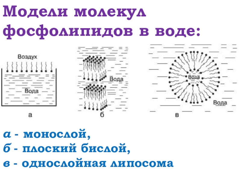 а - монослой, б - плоский бислой, в - однослойная липосомаМодели молекул фосфолипидов в воде: