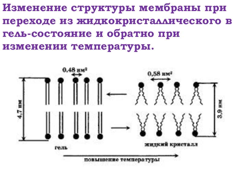 Слайд 15Изменение структуры мембраны при переходе из жидкокристаллического в гель-состояние и обратно