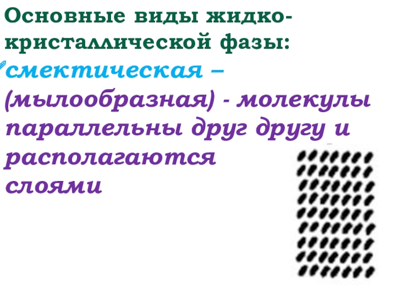 Основные виды жидко-кристаллической фазы: смектическая – (мылообразная) - молекулы параллельны друг другу и располагаются слоями
