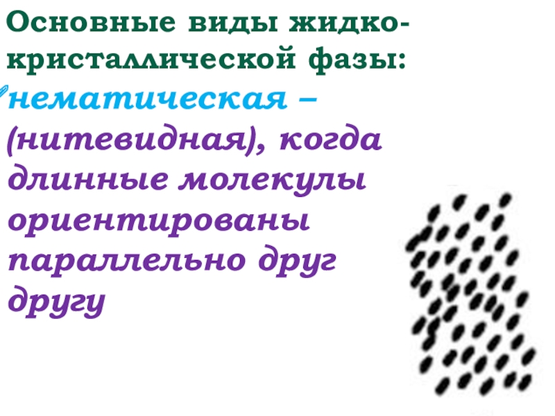 Основные виды жидко-кристаллической фазы: нематическая – (нитевидная), когда длинные молекулы ориентированы параллельно друг другу