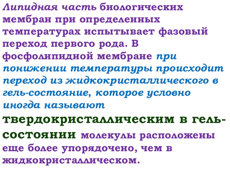 Слайд 14Липидная часть биологических мембран при определенных температурах испытывает фазовый переход первого