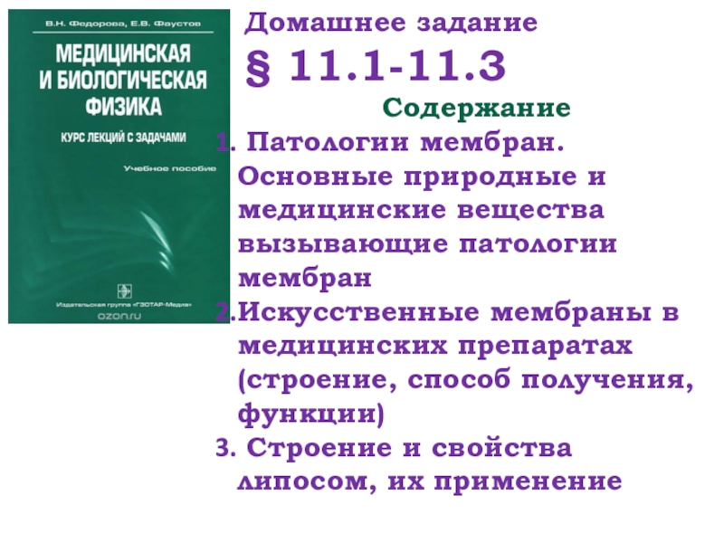 Домашнее задание§ 11.1-11.3 Содержание Патологии мембран. Основные природные и медицинские вещества вызывающие патологии мембран Искусственные мембраны в