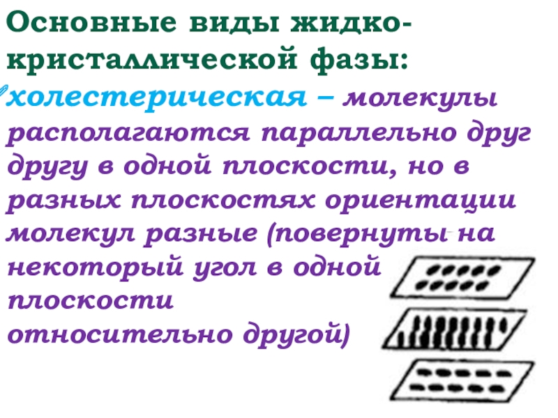 Основные виды жидко-кристаллической фазы: холестерическая – молекулы располагаются параллельно друг другу в одной плоскости, но в разных
