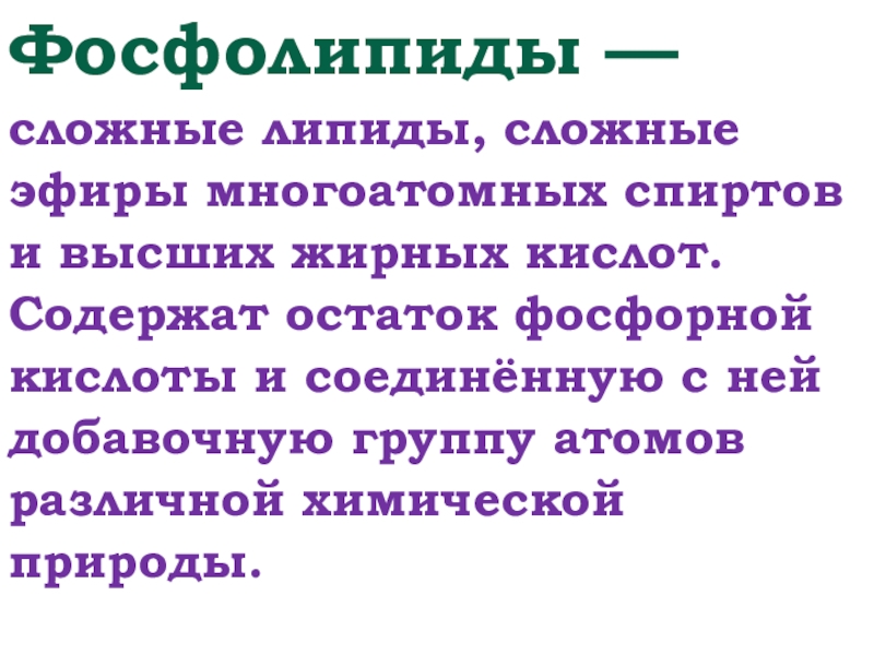 Фосфолипиды — сложные липиды, сложные эфиры многоатомных спиртов и высших жирных кислот. Содержат остаток фосфорной кислоты и соединённую