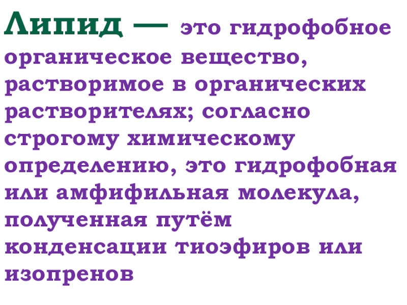 Слайд 4Липид — это гидрофобное органическое вещество, растворимое в органических растворителях; согласно строгому