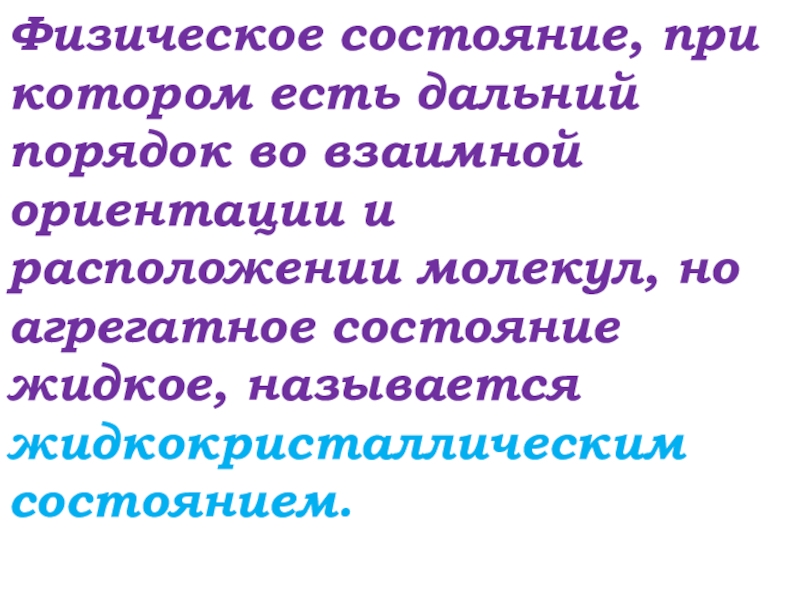 Слайд 7Физическое состояние, при котором есть дальний порядок во взаимной ориентации и расположении