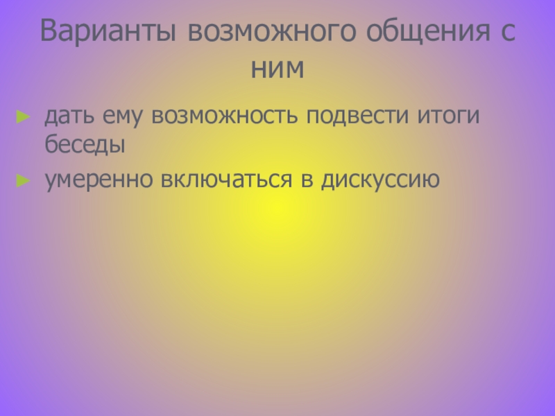 Варианты возможного общения с нимдать ему возможность подвести итоги беседыумеренно включаться в дискуссию