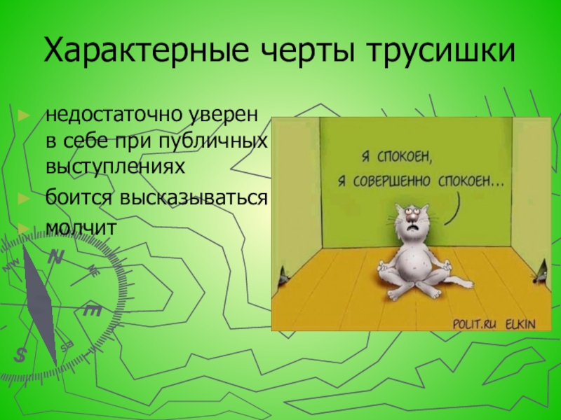 Характерные черты трусишкинедостаточно уверен в себе при публичных выступленияхбоится высказыватьсямолчит
