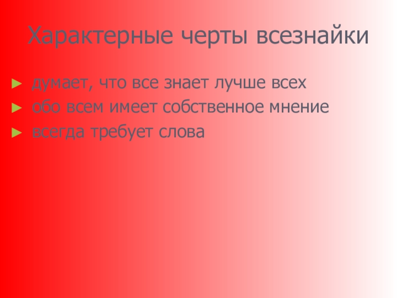 Характерные черты всезнайкидумает, что все знает лучше всехобо всем имеет собственное мнениевсегда требует слова