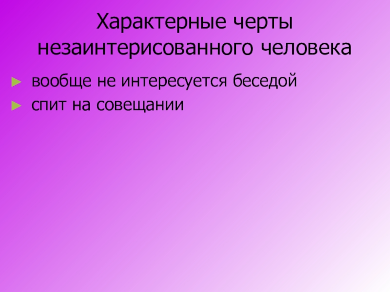 Характерные черты незаинтерисованного человекавообще не интересуется беседойспит на совещании