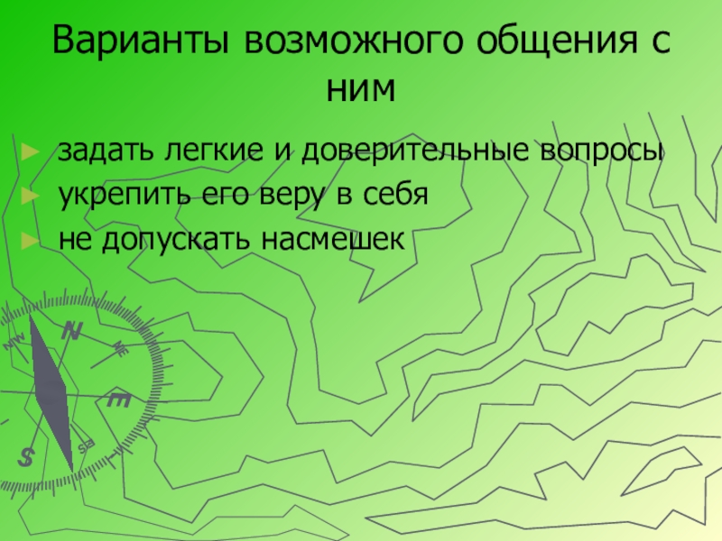 Варианты возможного общения с нимзадать легкие и доверительные вопросыукрепить его веру в себяне допускать насмешек
