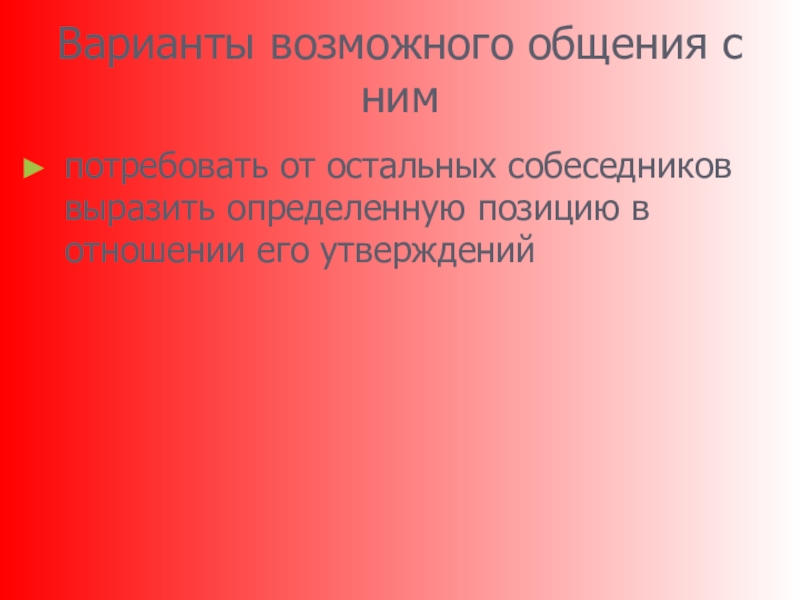 Варианты возможного общения с нимпотребовать от остальных собеседников выразить определенную позицию в отношении его утверждений