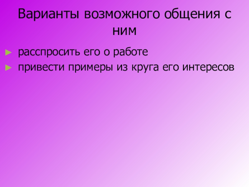 Варианты возможного общения с нимрасспросить его о работепривести примеры из круга его интересов