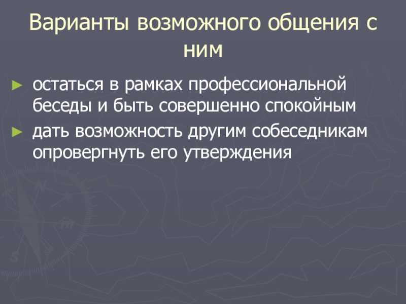 Варианты возможного общения с нимостаться в рамках профессиональной беседы и быть совершенно спокойнымдать возможность другим собеседникам опровергнуть