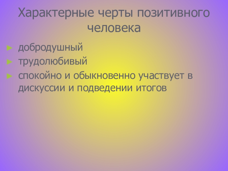 Характерные черты позитивного человекадобродушныйтрудолюбивыйспокойно и обыкновенно участвует в дискуссии и подведении итогов