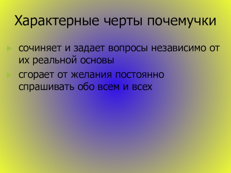 Характерные черты почемучкисочиняет и задает вопросы независимо от их реальной основысгорает от желания постоянно спрашивать обо всем