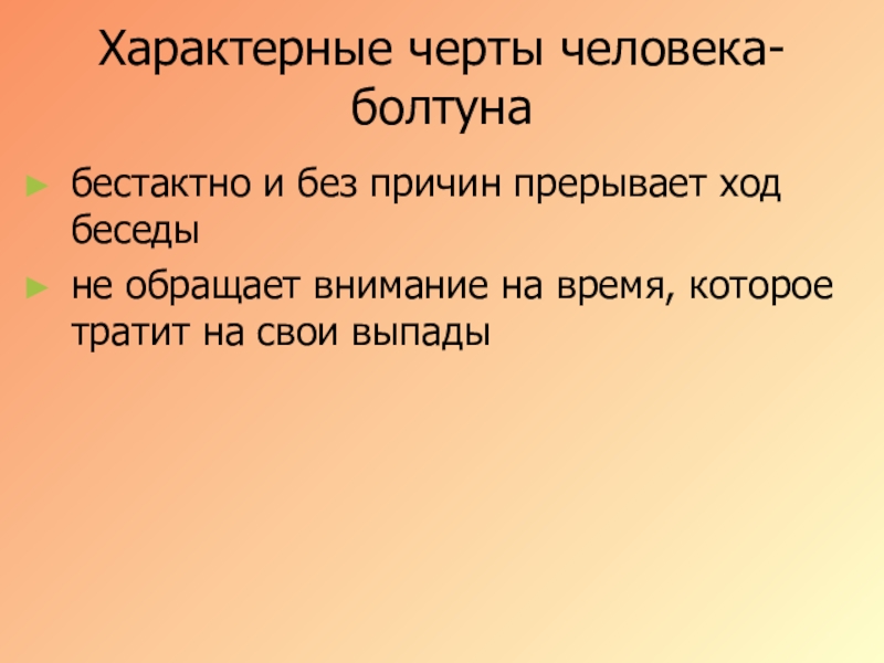 Характерные черты человека-болтунабестактно и без причин прерывает ход беседыне обращает внимание на время, которое тратит на свои