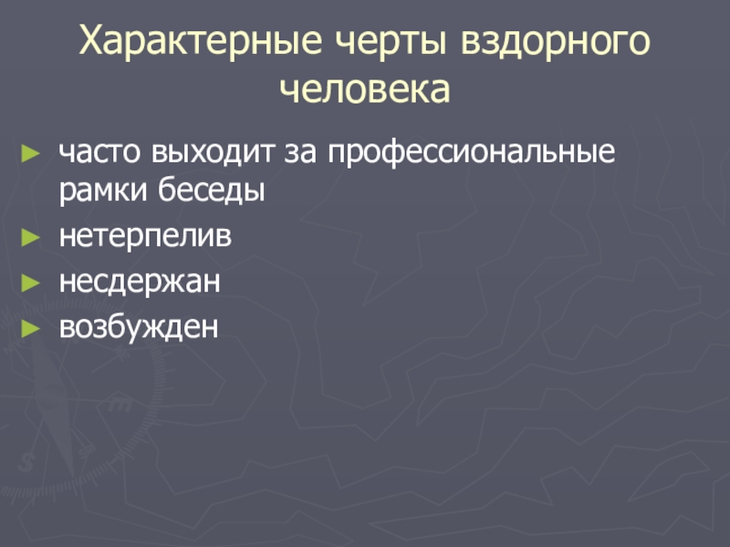 Характерные черты вздорного человекачасто выходит за профессиональные рамки беседынетерпеливнесдержанвозбужден