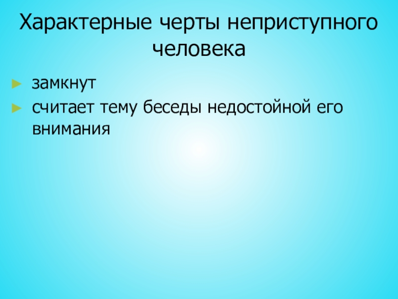 Характерные черты неприступного человеказамкнутсчитает тему беседы недостойной его внимания