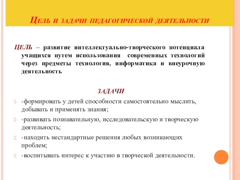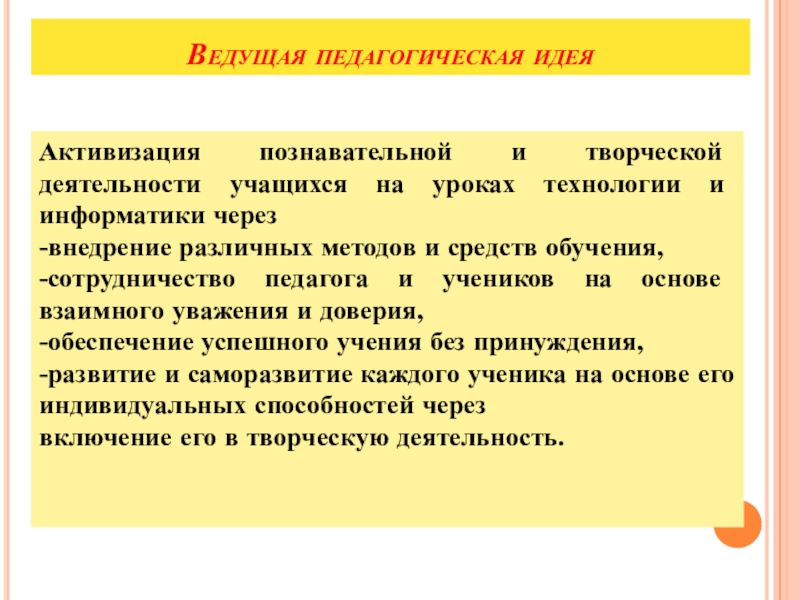 Ценность развития творческих способностей состоит в том, что он реализуется в практической деятельности. Применение проектной технологии, технологии проблемного обучения, ИКТ-технологии, ЭОР на уроках и внеурочной деятельности позволяет сформировать высокий познавательный интерес, познавательную активность, влекущую за собой высокую познавательную деятельность, что в итоге повышает мотивацию учащихся к более качественному усвоению предмета, а в дальнейшем и к выбору профессии.
