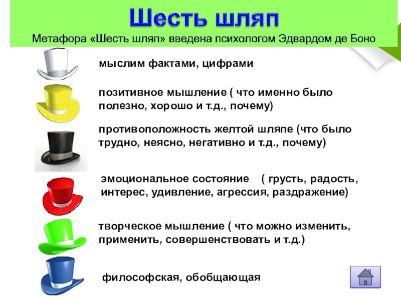противоположность желтой шляпе (что было трудно, неясно, негативно и т.д., почему)