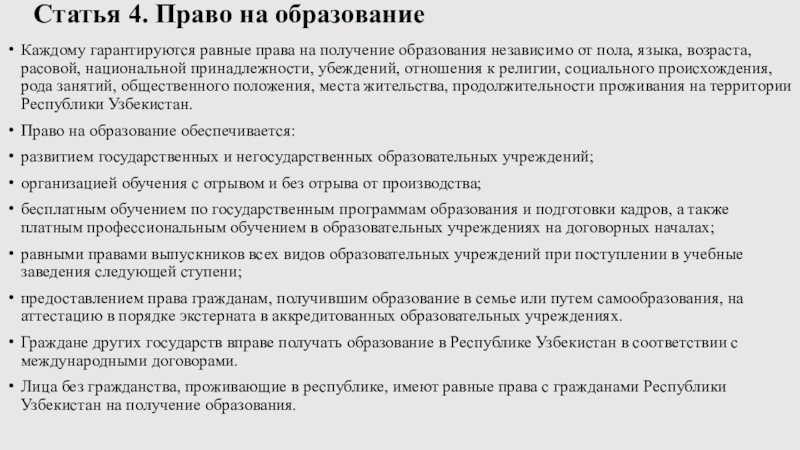 независимо от пола, языка, возраста, расовой, национальной принадлежности, убеждений, отношения к религии, социального происхождения, рода занятий, общественного положения, места жительства, продолжительности проживания на территории Республики Узбекистан.