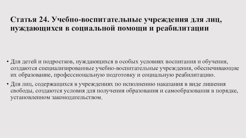 Слайд 23Статья 24. Учебно-воспитательные учреждения для лиц, нуждающихся в социальной помощи и