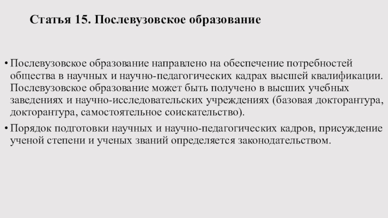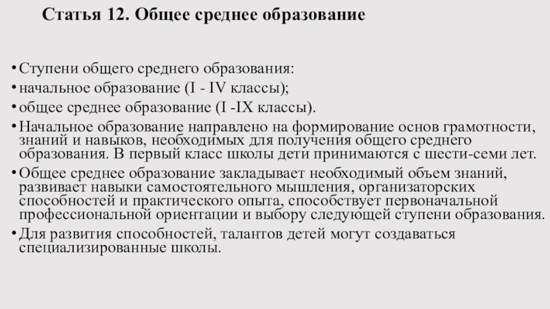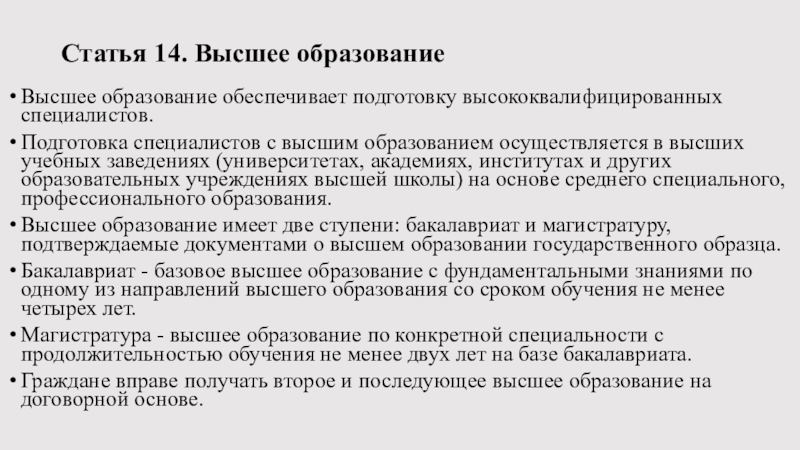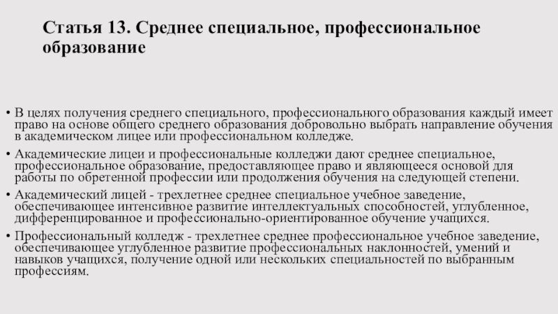 Слайд 12Статья 13. Среднее специальное, профессиональное