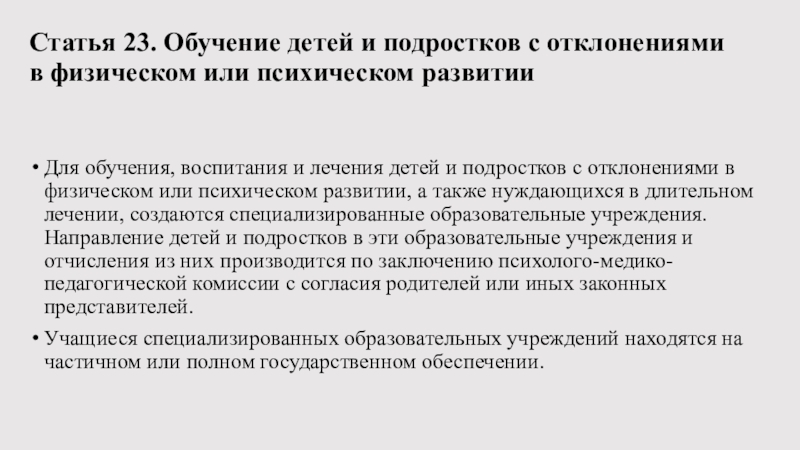 Слайд 22Статья 23. Обучение детей и подростков с отклонениями