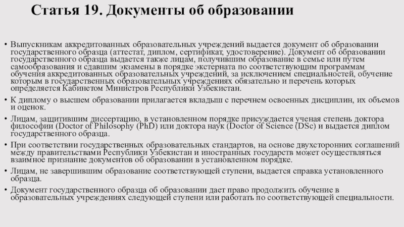 образовании государственного образца (аттестат, диплом, сертификат, удостоверение). Документ об образовании государственного образца выдается также лицам, получившим образование в семье или путем самообразования и сдавшим экзамены в порядке экстерната по соответствующим программам обучения аккредитованных образовательных учреждений, за исключением специальностей, обучение которым в государственных образовательных учреждениях обязательно и перечень которых определяется Кабинетом Министров Республики Узбекистан.