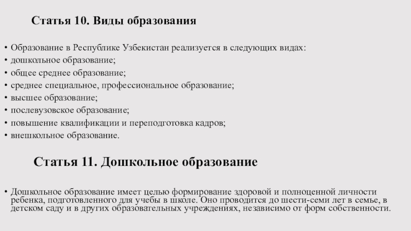 Образование в Республике Узбекистан реализуется в следующих видах: