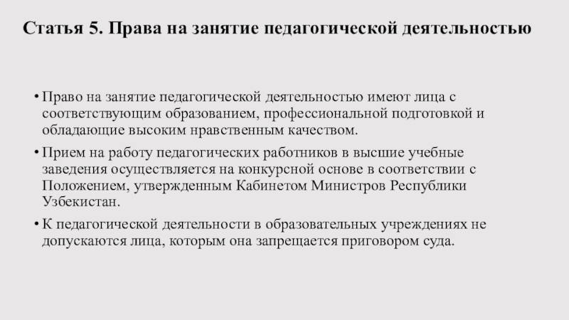 Слайд 5Статья 5. Права на занятие педагогической деятельностью