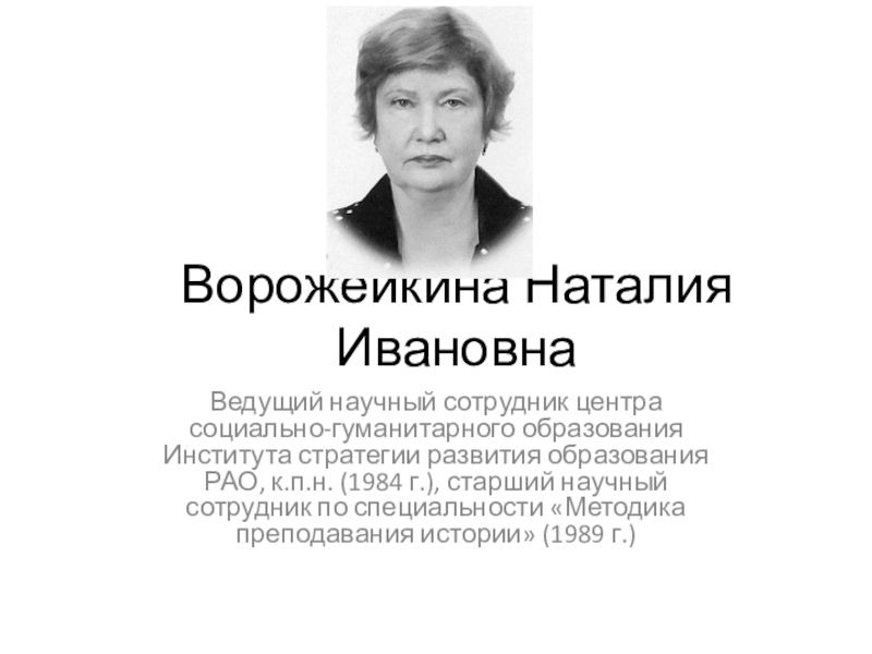 образования РАО, к.п.н. (1984 г.), старший научный сотрудник по специальности «Методика преподавания истории» (1989 г.)