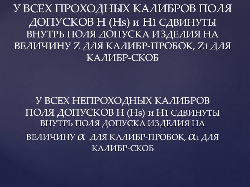 У ВСЕХ НЕПРОХОДНЫХ КАЛИБРОВ ПОЛЯ ДОПУСКОВ Н (Нs) и Н1 СДВИНУТЫ ВНУТРЬ ПОЛЯ ДОПУСКА ИЗДЕЛИЯ НА ВЕЛИЧИНУ α ДЛЯ КАЛИБР-ПРОБОК, α1 ДЛЯ КАЛИБР-СКОБ