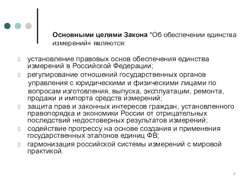 Слайд 3Основными целями Закона "Об обеспечении единства измерений« являются: