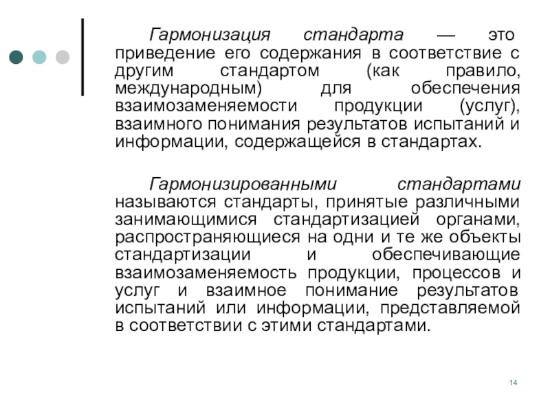 Слайд 14 Гармонизация стандарта — это приведение его содержания в соответствие с другим