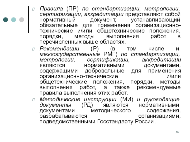 Слайд 15Правила (ПР) по стандартизации, метрологии, сертификации, аккредитации представляют собой нормативный документ,