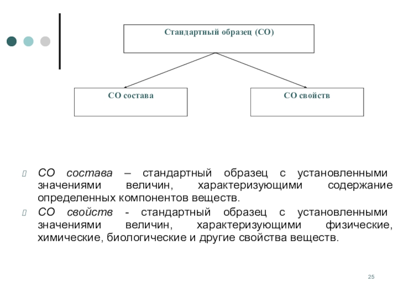 Слайд 25СО состава – стандартный образец с установленными значениями величин, характеризующими содержание