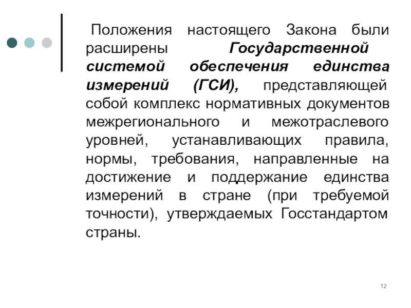 Слайд 12 Положения настоящего Закона были расширены Государственной системой обеспечения единства измерений (ГСИ),