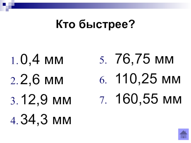 Кто быстрее?0,4 мм2,6 мм12,9 мм34,3 мм76,75 мм110,25 мм160,55 мм