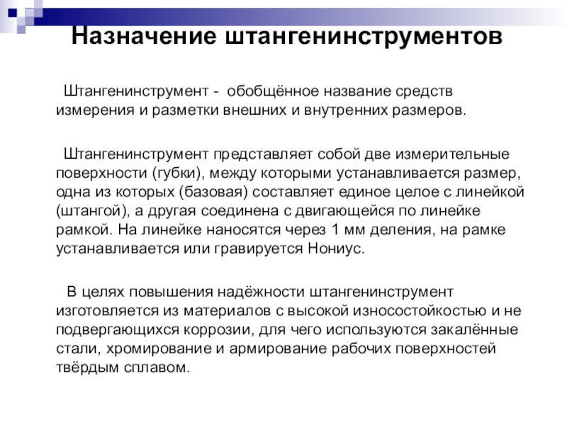 Назначение штангенинструментов Штангенинструмент -  обобщённое название средств измерения и разметки внешних и внутренних размеров. Штангенинструмент представляет собой две измерительные поверхности (губки), между которыми устанавливается размер, одна из которых (базовая) составляет единое целое с линейкой (штангой), а