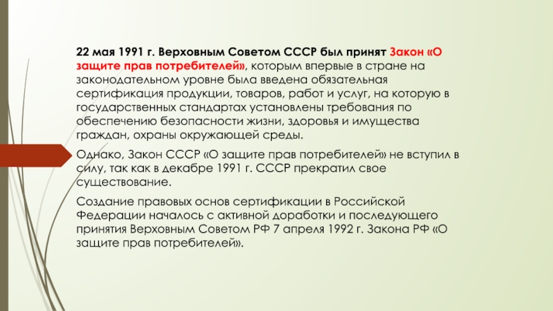 Создание правовых основ сертификации в Российской Федерации началось с активной доработки и последующего принятия Верховным Советом РФ 7 апреля 1992 г. Закона РФ «О защите прав потребителей».