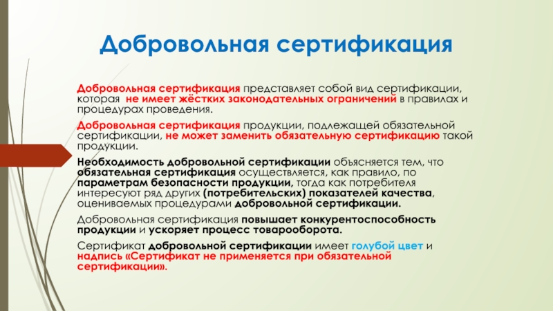 Добровольная сертификация представляет собой вид сертификации, которая не имеет жёстких
