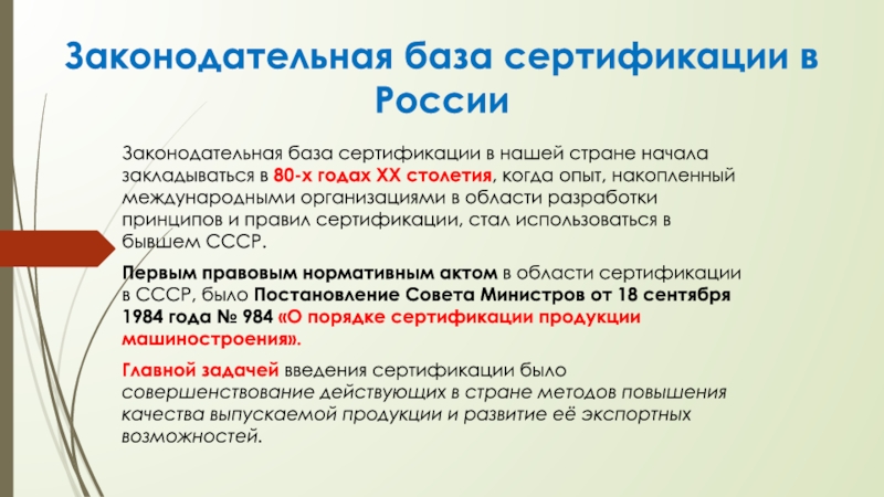 Первым правовым нормативным актом в области сертификации в СССР, было Постановление Совета Министров от 18 сентября 1984 года № 984 «О порядке сертификации продукции машиностроения».
