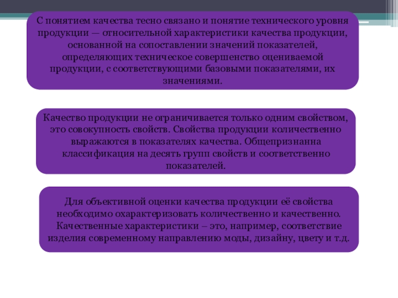 Для объективной оценки качества продукции её свойства необходимо охарактеризовать количественно и качественно. Качественные характеристики – это, например, соответствие изделия современному направлению моды, дизайну, цвету и т.д.