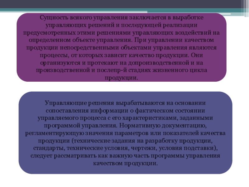 Управляющие решения вырабатываются на основании сопоставления информации о фактическом состоянии управляемого процесса с его характеристиками, заданными программой управления. Нормативную документацию, регламентирующую значения параметров или показателей качества продукции (технические задания на разработку продукции, стандарты, технические условия, чертежи, условия подставки), следует рассматривать как важную часть программы управления качеством продукции.